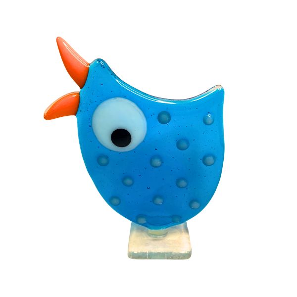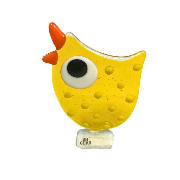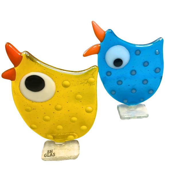 Her finder du en sjov kylling med store nysgerrige øjne i glas fra kunstneren SH Glas. Den pynter fint hele året, men er også fin til højtider som eksempelvis til påske. Den kommer i enten nuancer af gul eller blå. Alle kyllinger er håndlavede, og der vil være variationer i størrelse, form og farve.