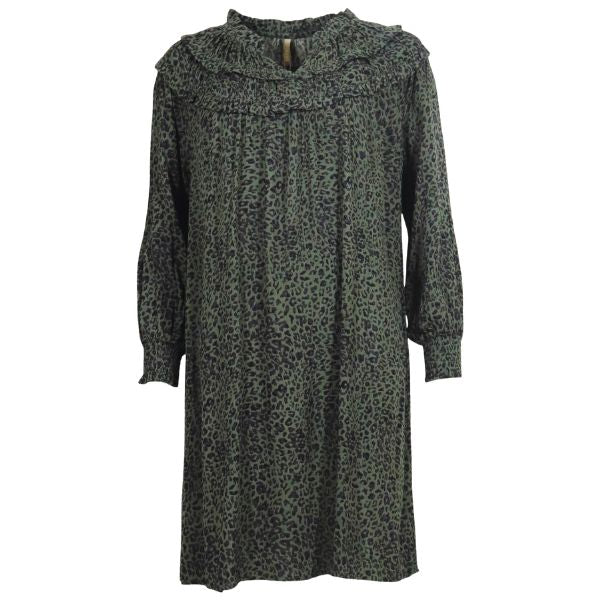 Leopold er en skøn tunika i et leopard print i en afdæmpet mørk grøn farve fra mærket Ofelia. Denne tunika har også en længde, der gør at den kan bruges som kort kjole. Den har fine flæser oppe omkring halsen og elastik for enden af de lange ærmer. Super smart at matche med et par strømpebukser og grove støvler.