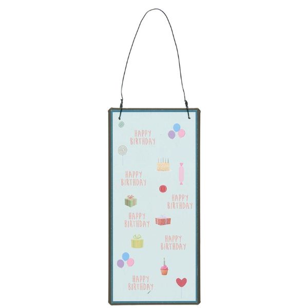 Oplev dette metalskilt med ordene "Happy Birthday" på i en blå farve med små gaver og balloner. Metalskiltet kommer med en wire, så det kan hænges på en krog. Vi har flere forskellige metalskilte med sjove citater til hverdagen og hjemmet. De fungerer også godt som gave.