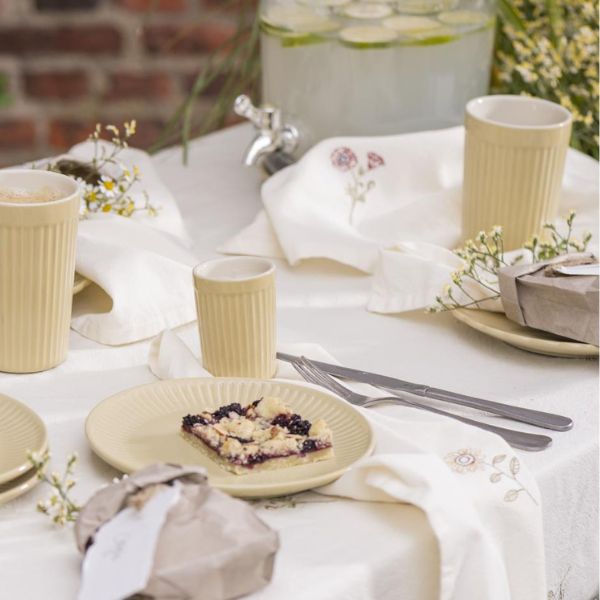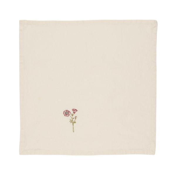 Her finder du en elegant simpel stofserviet i en offwhite farve med en lille rød valmue blomst broderet på. Det kommer her i en kvadratisk form, der måler 40*40 cm. Dens neutrale farver og simple detaljer er elegant på en bordopdækning.