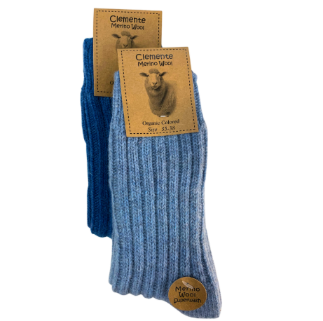 Her finder du en 2-pak med tykke sokker i merino fra danske Clemente Copenhagen - her kommer de i farvekombinationen lyseblå og blå.