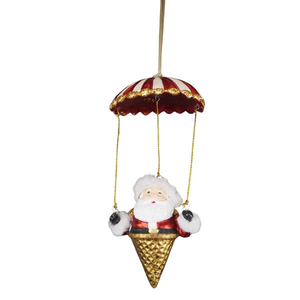 Se her den sjove julefigur med en "Vaffel-julemand i faldskærm", som er ved at flyve væk. Vi er særligt kendt for disse anderledes julefigurer, som hos os også går under navnet "Eventyrsfigurer".